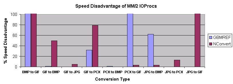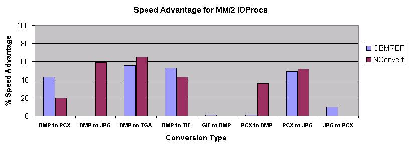 This data has been normalized to the MM/2 conversion times. Positive percentages mean speed advantage goes to MM/2. Negative percentages give speed advantage to either GBM or NConvert over MM/2. BMP conversion to PCX, TGA or TIF are well supported by MM/2 and are fast. Conversion of any image to GIF using MM/2 is quite slow. There is a noticeable delay before the process is completed, even with small images. Unless you convert hundreds of images a day, you have to ask yourself if speed is really an issue here.
