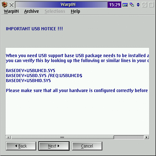The WarpIN install warns that if you need USB support, you have to manually altar your config.sys file. If you select to have WarpIN update your config.sys file, it will insert a line to load a USB driver specific for gPhoto2/2 - gph2usb.sys. If you don't have a USB setup, this will cause an error message on bootup.