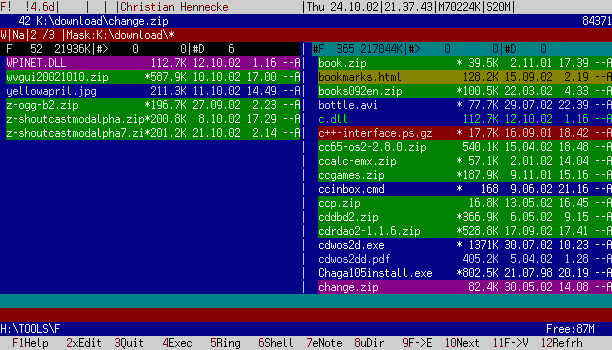 Unlike other file managers, F doesn't mimic the classic Norton Commander. Hotkeys follow their own logic and are grouped by application to the currently highlighted file or the currently selected set of files. The split-window display does remind one of Norton Commander at first but goes beyond that.