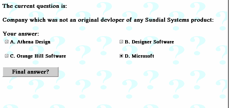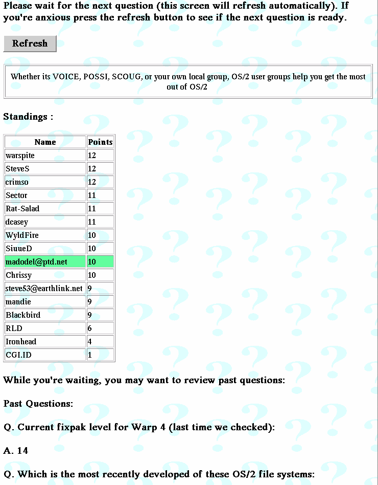 Im Dezember fand eine tolle Speakup-Sitzung mit Sundial am 4. statt. Die Jungs von Sundial haben wirklich ein Händchen für gewisse unterhaltsame und weiterbildende Veranstaltungen, wie Warped Jeopardy, der Hit bei Warpstock, Warptech und Warped Expo West. Für IRC schufen sie eine neue, auf Fragen zur Geschichte von OS/2, Sundial und VOICE basierende Show, die etwas an die Ferhsehsendung "Wer wird Millionär?" erinnerte. Wenn Sie dies verpaßt haben, haben Sie eine wirklich tolle Show verpaßt. Sie können sich die Logdatei für das "Sundials Weihnachten im Dezember" Speakup unter http://www.os2voice.org/logs/V120400.LOG.html anschauen. Sundial kombinierte die Nutzung von IRC mit einer HTML-basierten Engine für dieses Spiel.