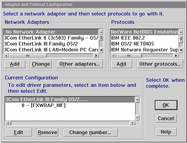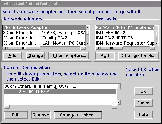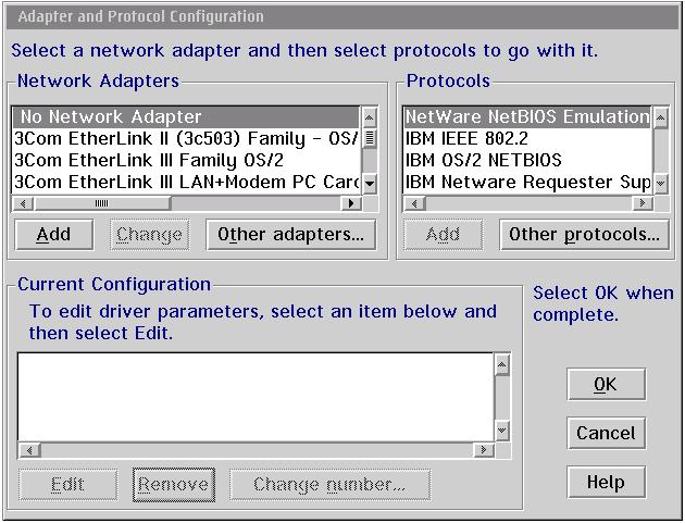 Wahrscheinlich hat die mit der Netzwerkkarte gelieferte CD an prominenter Stelle ein Installationsprogramm für Windows, falls die Karte von OS/2 unterstützt wird, sollte es aber in irgendeinem Unterverzeichnis auch OS/2-Treiber geben. Sobald Sie bei der Adapter- und Protokoll-Konfiguration angekommen sind, müssen Sie einen Treiber hinzufügen. Wenn Sie Glück haben, finden Sie in der Liste bereits einen passenden Treiber, falls nicht, klicken Sie auf Weitere Adapter und steuern Sie den Ordner an, in dem auf der CD die OS/2-Treiber liegen. Wenn alles glatt gelaufen ist, sollten die Treiber nach x:\ibmcom\macs und die PROTOCOL.INI nach x:\ibmcom kopiert worden sein. Beim nächsten Neustart sollten Sie eine Meldung sehen, dass die Ethernet-Treiber geladen werden. Sollte der Treiber nicht geladen werden, haben Sie den falschen ausgewählt. Im Abschnitt über meine zweite Installation werde ich erzählen, wie ich diese Klippe umschifft habe.