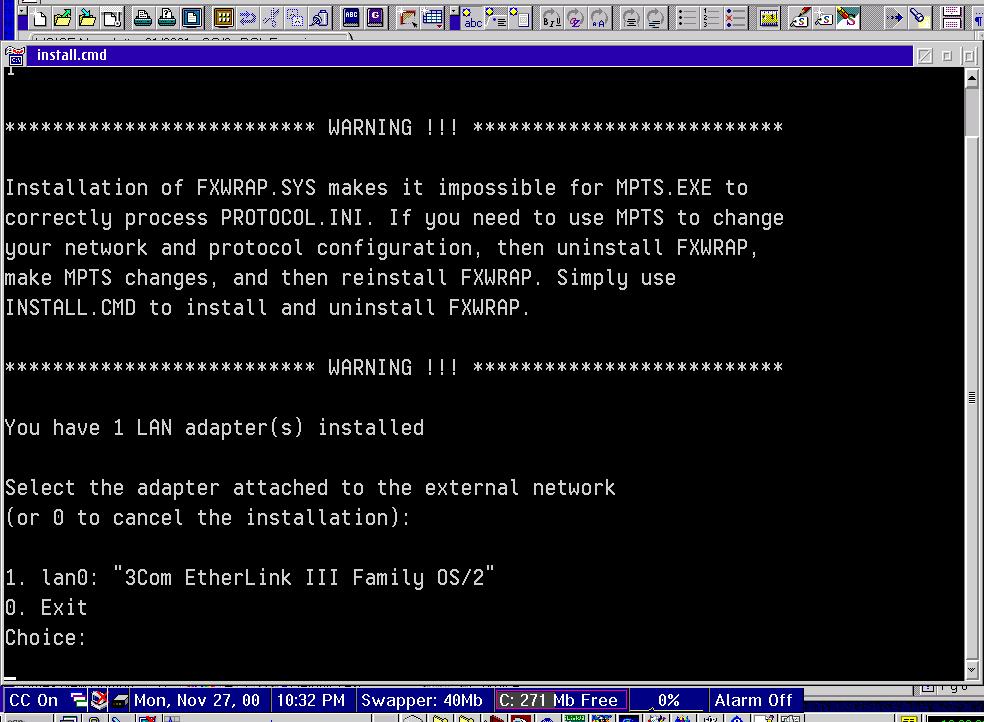Ich verwende eine Dual-Boot Konfiguration, also habe ich meinen DSL-Anschluss (ADSL im Fall Mindspring) für Windows 98 bestellt. Der Techniker kam, hat die Hard- und Software installiert, und nach anderthalb Stunden lief alles. Sobald er aus dem Haus war, bin ich daran gegangen, OS/2 ins Netz zu bringen. Nachdem unter Windows alles lief, war OS/2 die einzige Variable.
