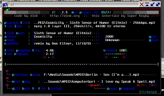 Z!s 80x25 Zeichen-Interface ist gut strukturiert und bietet alle Informationen, die man sich wünschen kann. Oben sieht man den Namen der gerade gespielten Datei und Zusatzinformationen wie Bitrate, Samplerate, und eine Mono/Stereo-Anzeige. Darunter sind nicht editierbare ID3 Tag-Informationen für die aktuelle Datei, dann eine Zeitanzeige und Lautstärkeregler und eine Art Fortschrittsbalken, der anzeigt, wieviel man vom jeweiligen Stück schon gehört hat. Mit der Maus kann man an jeden beliebigen Punkt im Stück springen, oder "<" und ">" anklicken, um 5 Sekunden in der jeweiligen Richtung zu überspringen. Diese Merkmale sind auch über die Tastatur zugänglich, man muß also die WPS nicht laufen haben, um z! vollständig verwenden zu können. Am unteren Rand des Fensters sieht man die Dateinamen des vorhergehenden und des nachfolgenden Titels in der Playlist. Man kann von hier aus ganz einfach in die jeweilige Richtung weiterspringen, Abspielen, Pause, Stop oder das Datei Öffnen-Fenster anwählen.