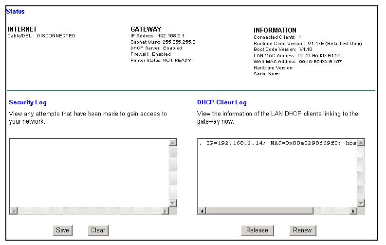 Enter your password, and then click on STATUS. In the Gateway column near the top of the page, you will see a list of items describing various conditions within the router. The last of these describes the state of the printer connected to the router. The state of the printer should say READY if the printer is properly connected to the parallel port of the router and if the printer is ready.
