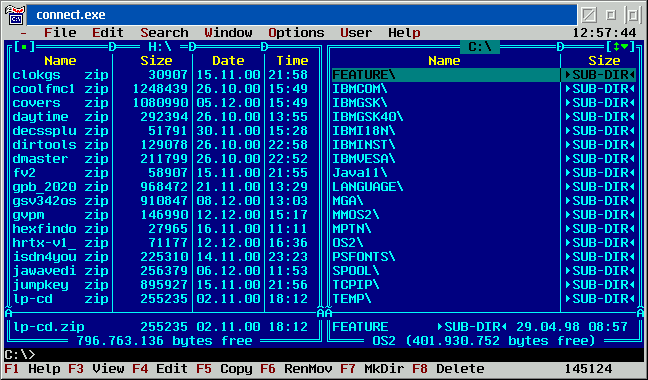 Zu meinen erklärten Lieblingen gehören jedoch in diesem Fall, obwohl ich ansonsten PM-Anwendungen eindeutig bevorzuge, Dateimanager, die als VIO-Anwendung arbeiten. Warum? Ganz einfach: sie sind meistens schneller und sie sind auch verfügbar, wenn man zu Wartungszwecken mal von Diskette booten oder mittels ALT-F1 auf die Kommandozeile zurückschalten muß. Sicherlich hat dies auch was mit meiner Computersozialisation zu tun: wer wie ich mit DOS und dem Norton Commander am Computer groß geworden ist, dem ist die Optik vertraut und er kann die entsprechenden F-Tastaturkürzel im Schlaf herbeten. Überdies findet sich auf nahezu allen Betriebsystemen ein entsprechendes Pendant, so dass man sich auch in fremden Umgebungen fast wie zuhause fühlt.