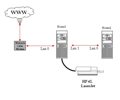 Damit ich nun mit beiden PCs ins Internet konnte, mußte der Hauptrechner immer eingeschaltet sein, ebenso, wenn ich von meinem zweiten Heimrechner (Home2) etwas drucken wollte. Die Lösung hierfür war relativ simpel: Ein Breitbandrouter mit eingebautem Druckserver. Ich entschied mich für einen SMC7004ABR, der 4 LAN-Anschlüsse hatte (ich konnte jetzt also bis zu 4 Rechner anschließen), einen WAN-Anschluß für die Verbindung mit meinem Motorola-Kabelmodem und zu guter Letzt einen Parallel-Port für den Druckserver (siehe Abbildung 2).